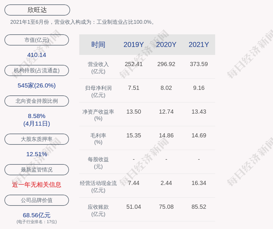 2021年1至6月份,欣旺达的营业收入构成为:工业制造业占比100.0%。