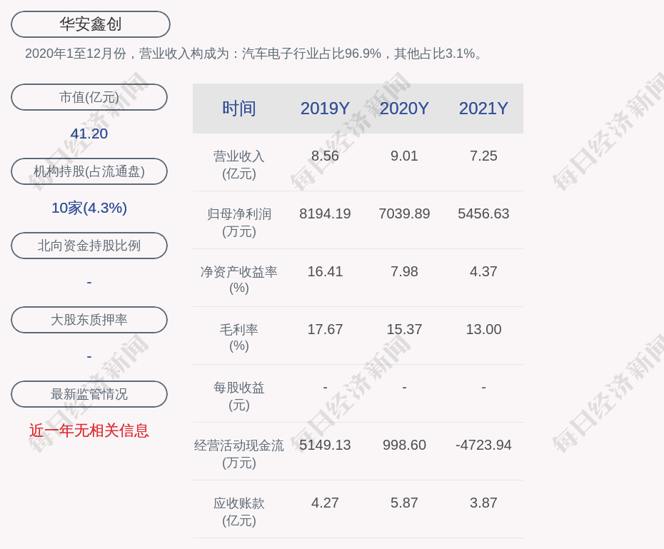 2020年1至12月份,华安鑫创的营业收入构成为:汽车电子行业占比96.9%,其他占比3.1%。