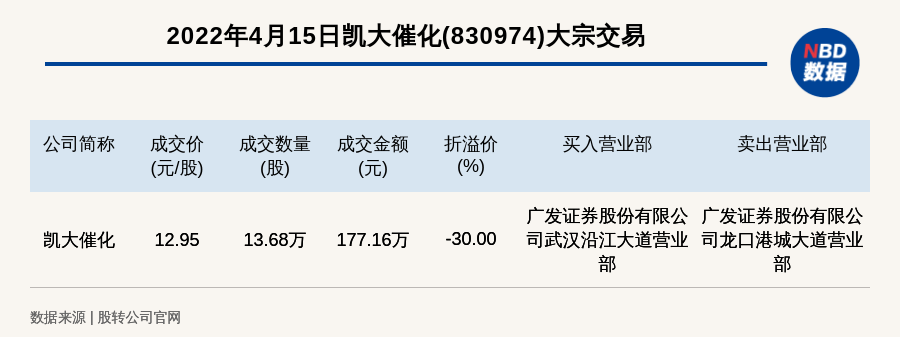每经讯,2022年4月15日,新三板创新层公司凯大催化(830974)发生一笔大宗交易,成交价12.95元/股,成交数量13.68万股,成交金额177.16万元,折价30%。买入营业部是广发证券股份有限公司武汉沿江大道营业部,卖出营业部是广发证券股份有限公司龙口港城大道营业部。