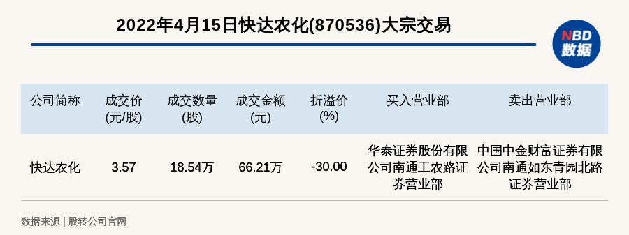 每经讯,2022年4月15日,新三板创新层公司快达农化(870536)发生一笔大宗交易,成交价3.57元/股,成交数量18.54万股,成交金额66.21万元,折价30%。买入营业部是华泰证券股份有限公司南通工农路证券营业部,卖出营业部是中国中金财富证券有限公司南通如东青园北路证券营业部。