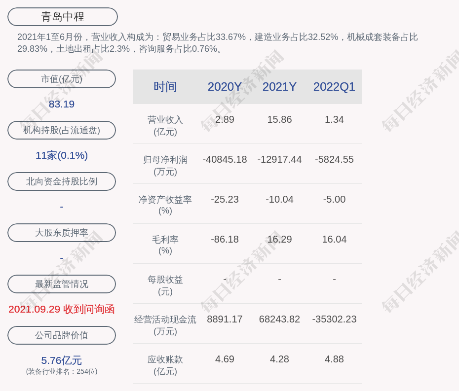 2021年1至6月份,青岛中程的营业收入构成为:贸易业务占比33.67%,建造业务占比32.52%,机械成套装备占比29.83%,土地出租占比2.3%,咨询服务占比0.76%。