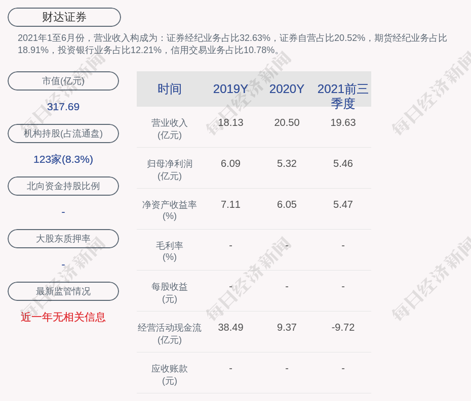 2021年1至6月份,财达证券的营业收入构成为:证券经纪业务占比32.63%,证券自营占比20.52%,期货经纪业务占比18.91%,投资银行业务占比12.21%,信用交易业务占比10.78%。