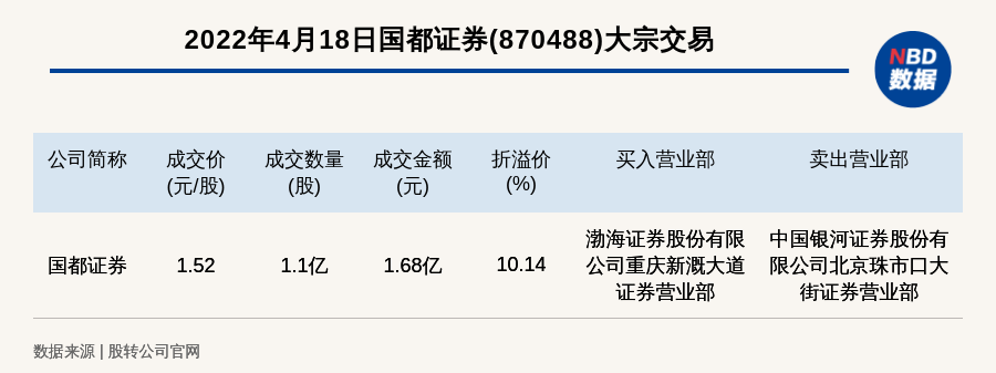 每经讯,2022年4月18日,新三板基础层公司国都证券(870488)发生一笔大宗交易,成交价1.52元/股,成交数量约1.1亿股,成交金额1.68亿元,溢价10.14%。买入营业部是渤海证券股份有限公司重庆新溉大道证券营业部,卖出营业部是中国银河证券股份有限公司北京珠市口大街证券营业部。