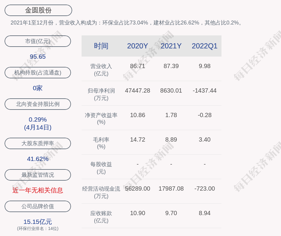 2021年1至12月份,金圆股份的营业收入构成为:环保业占比73.04%,建材业占比26.62%,其他占比0.2%。