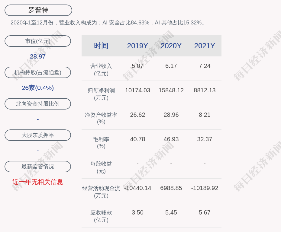 2020年1至12月份,罗普特的营业收入构成为:AI+安全占比84.63%,AI+其他占比15.32%。