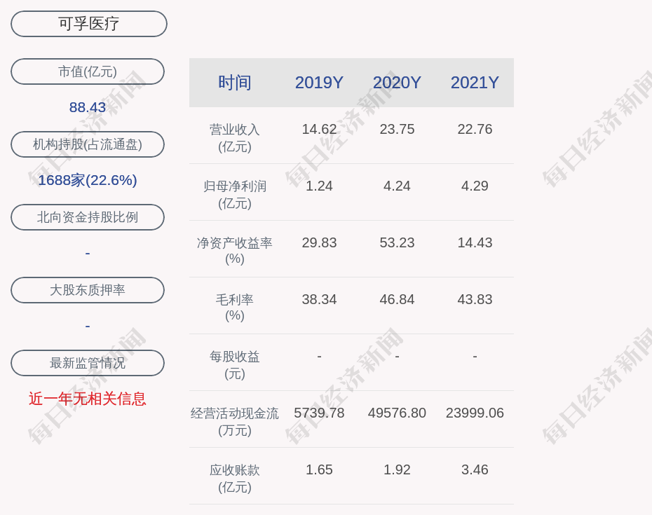 每经AI快讯,可孚医疗(SZ 301087,收盘价:55.14元)4月19日晚间发布年度业绩报告称,2021年营业收入约22.76亿元,同比减少4.19%;归属于上市公司股东的净利润约4.29亿元,同比增加1.16%;基本每股收益3.39元,同比减少3.97%。拟每10股派发现金红利16元(含税)、不送红股、以资本公积金向全体股东每10股转增3股。