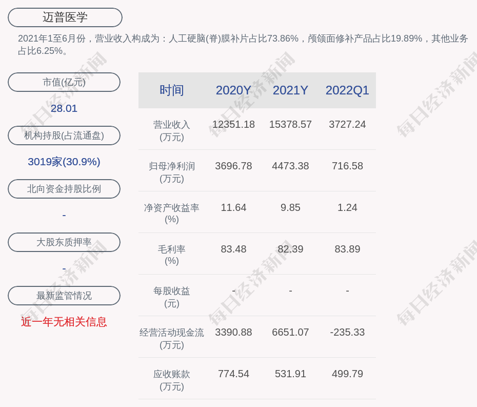 2021年1至6月份,迈普医学的营业收入构成为:人工硬脑(脊)膜补片占比73.86%,颅颌面修补产品占比19.89%,其他业务占比6.25%。