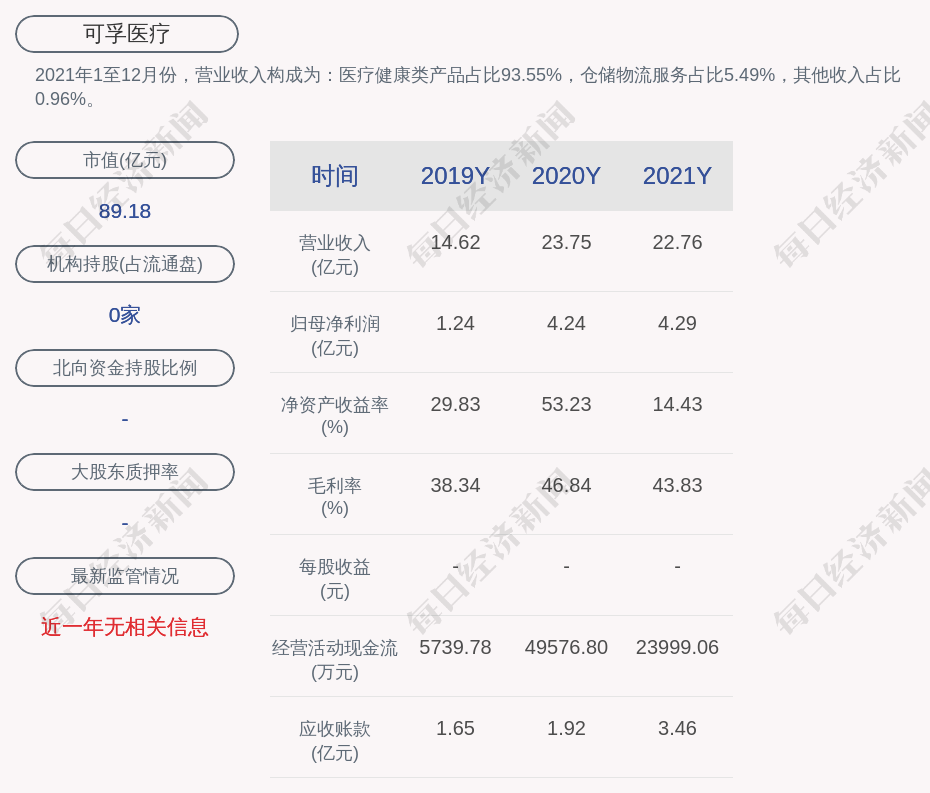 2021年1至12月份,可孚医疗的营业收入构成为:医疗健康类产品占比93.55%,仓储物流服务占比5.49%,其他收入占比0.96%。