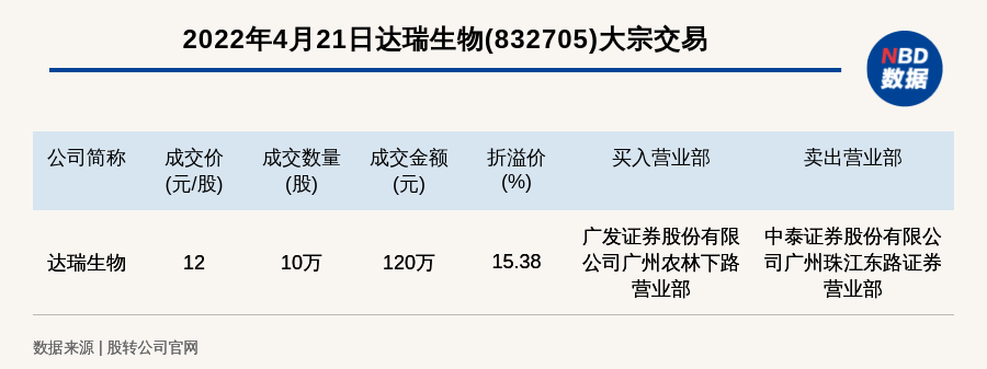 每经讯,2022年4月21日,新三板创新层公司达瑞生物(832705)发生一笔大宗交易,成交价12元/股,成交数量10万股,成交金额120万元,溢价15.38%。买入营业部是广发证券股份有限公司广州农林下路营业部,卖出营业部是中泰证券股份有限公司广州珠江东路证券营业部。
