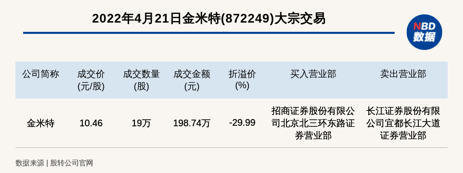 每经讯,2022年4月21日,新三板创新层公司金米特(872249)发生一笔大宗交易,成交价10.46元/股,成交数量19万股,成交金额198.74万元,折价29.99%。买入营业部是招商证券股份有限公司北京北三环东路证券营业部,卖出营业部是长江证券股份有限公司宜都长江大道证券营业部。