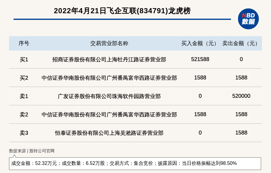 每经讯,2022年4月21日,新三板创新层公司飞企互联(834791)登上龙虎榜,交易方式是集合竞价,披露原因是当日价格振幅达到98.50%,成交数量6.52万股,成交金额52.32万元。买一席位为招商证券股份有限公司上海牡丹江路证券营业部,买入52.16万元;卖一席位为广发证券股份有限公司珠海软件园路营业部,卖出52万元。
