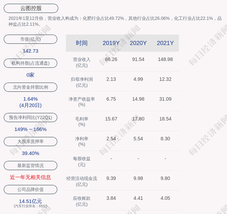 每经AI快讯,云图控股(SZ 002539,收盘价:14.13元)4月21日晚间发布公告称,牟嘉云质押1964万股。截至本公告日,宋睿累计质押股数约为1.22亿股,占其所持股份比例为39.4%。珠海阿巴马资产管理有限公司-阿巴马元享红利99号私募证券投资基金累计质押股数为0股,占其所持股份比例为0%。珠海阿巴马资产管理有限公司-阿巴马元享红利100号私募证券投资基金累计质押股数为0股,占其所持股份比例为0%。牟嘉云累计质押股数为5180万股,占其所持股份比例为48.77%。珠海阿巴马资产管理有限公司-阿巴马元享红利31号私募证券投资基金累计质押股数为0股,占其所持股份比例为0%。珠海阿巴马资产管理有限公司-阿巴马元享红利32号私募证券投资基金累计质押股数为0股,占其所持股份比例为0%。张明达累计质押股数为0股,占其所持股份比例为0%。