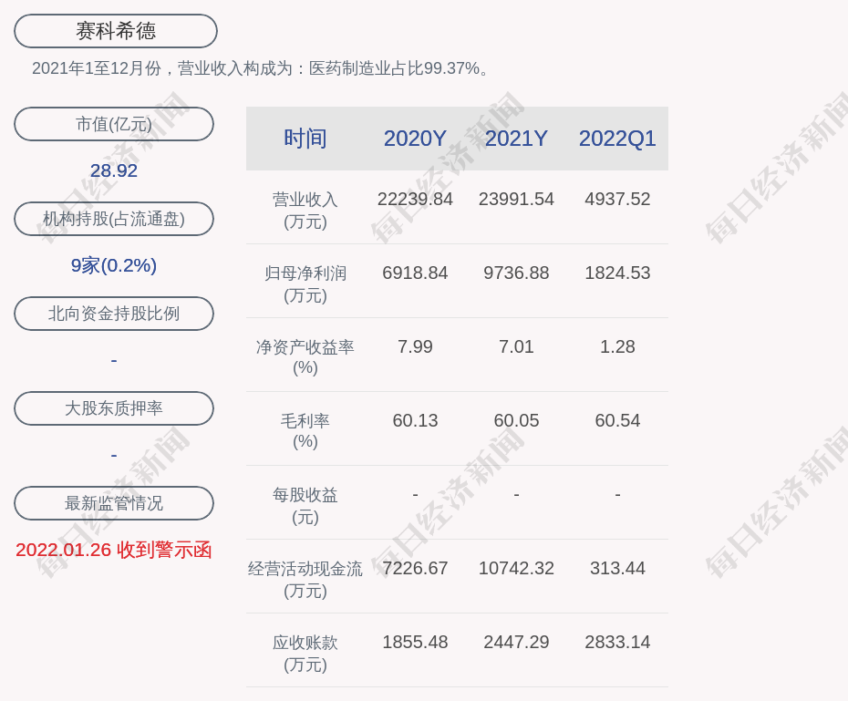 2021年1至12月份,赛科希德的营业收入构成为:医药制造业占比99.37%。