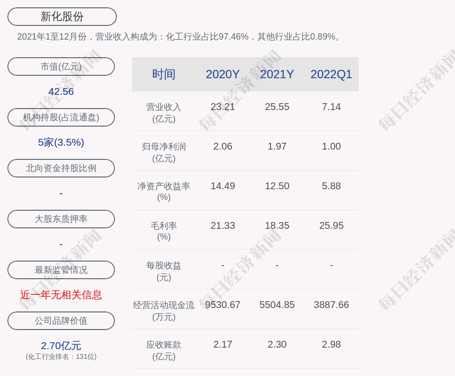 2021年1至12月份,新化股份的营业收入构成为:化工行业占比97.46%,其他行业占比0.89%。