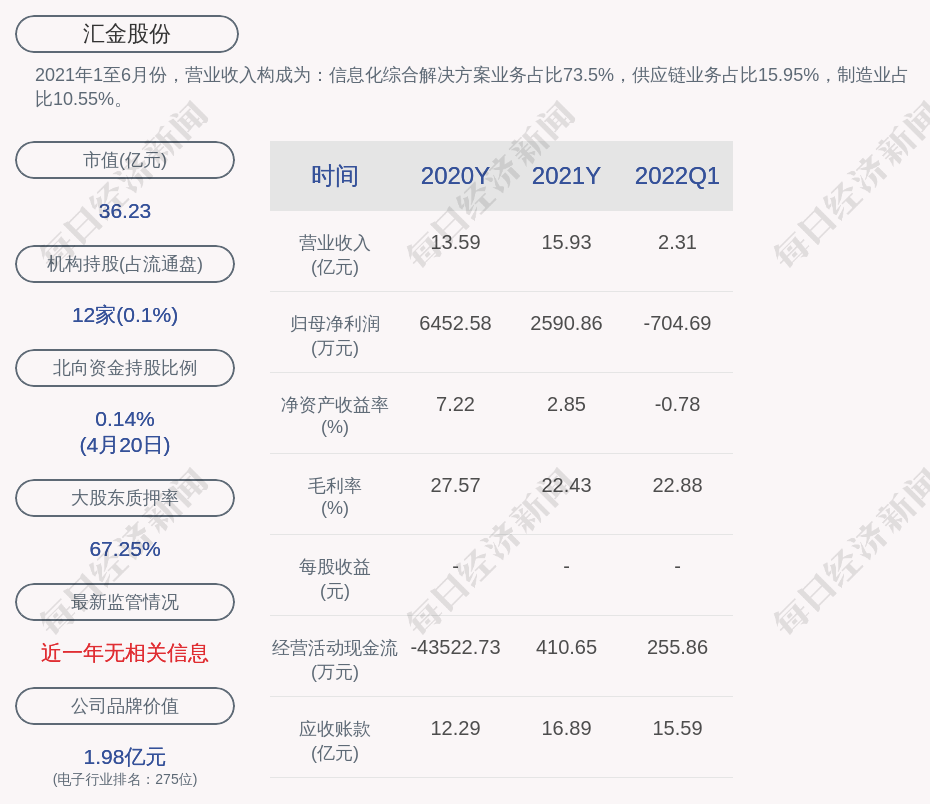 2021年1至6月份,汇金股份的营业收入构成为:信息化综合解决方案业务占比73.5%,供应链业务占比15.95%,制造业占比10.55%。