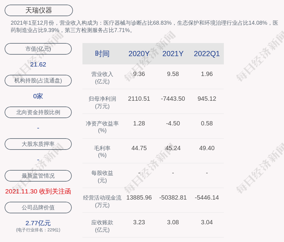 2021年1至12月份,天瑞仪器的营业收入构成为:医疗器械与诊断占比68.83%,生态保护和环境治理行业占比14.08%,医药制造业占比9.39%,第三方检测服务占比7.71%。