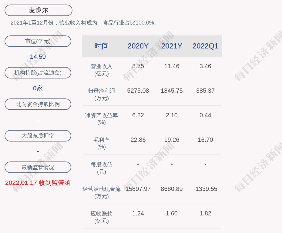 2021年1至12月份,麦趣尔的营业收入构成为:食品行业占比100.0%。