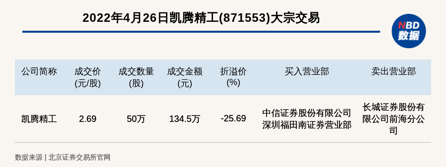 每经讯,2022年4月26日,北交所上市公司凯腾精工(871553)发生一笔大宗交易,成交价2.69元/股,成交数量50万股,成交金额134.5万元,折价25.69%。买入营业部是中信证券股份有限公司深圳福田南证券营业部,卖出营业部是长城证券股份有限公司前海分公司。