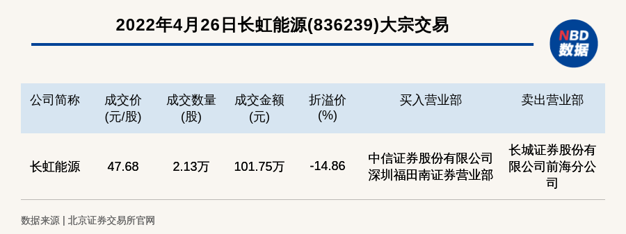 每经讯,2022年4月26日,北交所上市公司长虹能源(836239)发生一笔大宗交易,成交价47.68元/股,成交数量2.13万股,成交金额101.75万元,折价14.86%。买入营业部是中信证券股份有限公司深圳福田南证券营业部,卖出营业部是长城证券股份有限公司前海分公司。