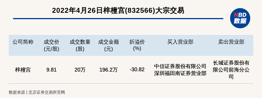 每经讯,2022年4月26日,北交所上市公司梓橦宫(832566)发生一笔大宗交易,成交价9.81元/股,成交数量20万股,成交金额196.2万元,折价30.82%。买入营业部是中信证券股份有限公司深圳福田南证券营业部,卖出营业部是长城证券股份有限公司前海分公司。