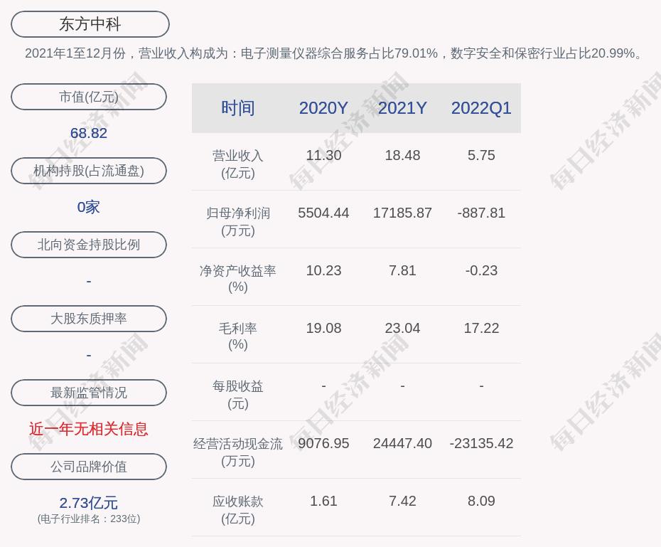 2021年1至12月份,东方中科的营业收入构成为:电子测量仪器综合服务占比79.01%,数字安全和保密行业占比20.99%。