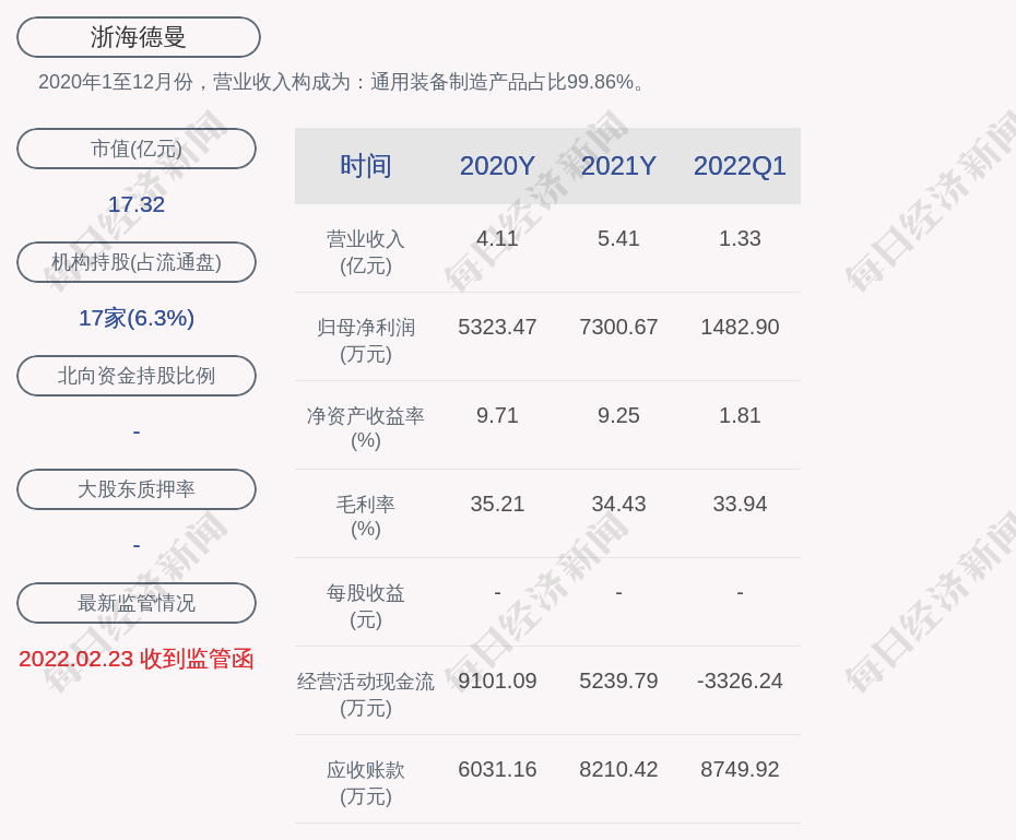 每经AI快讯,浙海德曼(SH 688577,收盘价:32.1元)4月26日晚间发布年度业绩报告称,2021年营业收入约5.41亿元,同比增加31.73%;归属于上市公司股东的净利润约7301万元,同比增加37.14%;基本每股收益1.35元,同比增加11.57%。拟每10股派发现金红利3元(含税)。