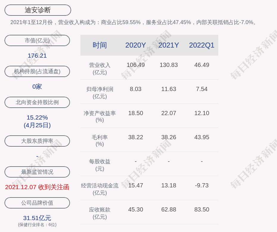 2021年1至12月份,迪安诊断的营业收入构成为:商业占比59.55%,服务业占比47.45%,内部关联抵销占比-7.0%。