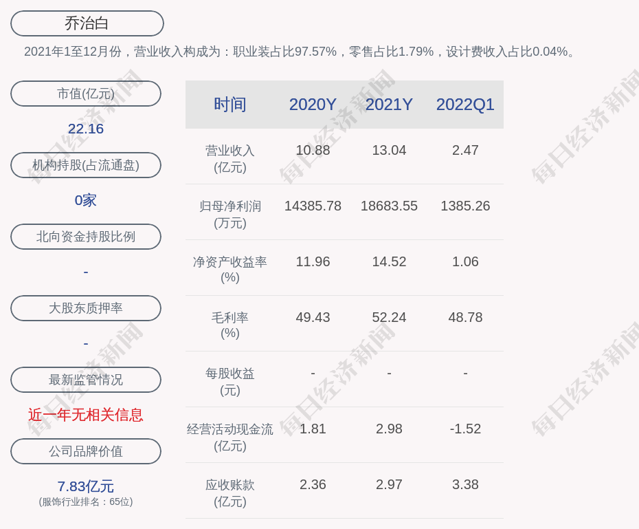 2021年1至12月份,乔治白的营业收入构成为:职业装占比97.57%,零售占比1.79%,设计费收入占比0.04%。