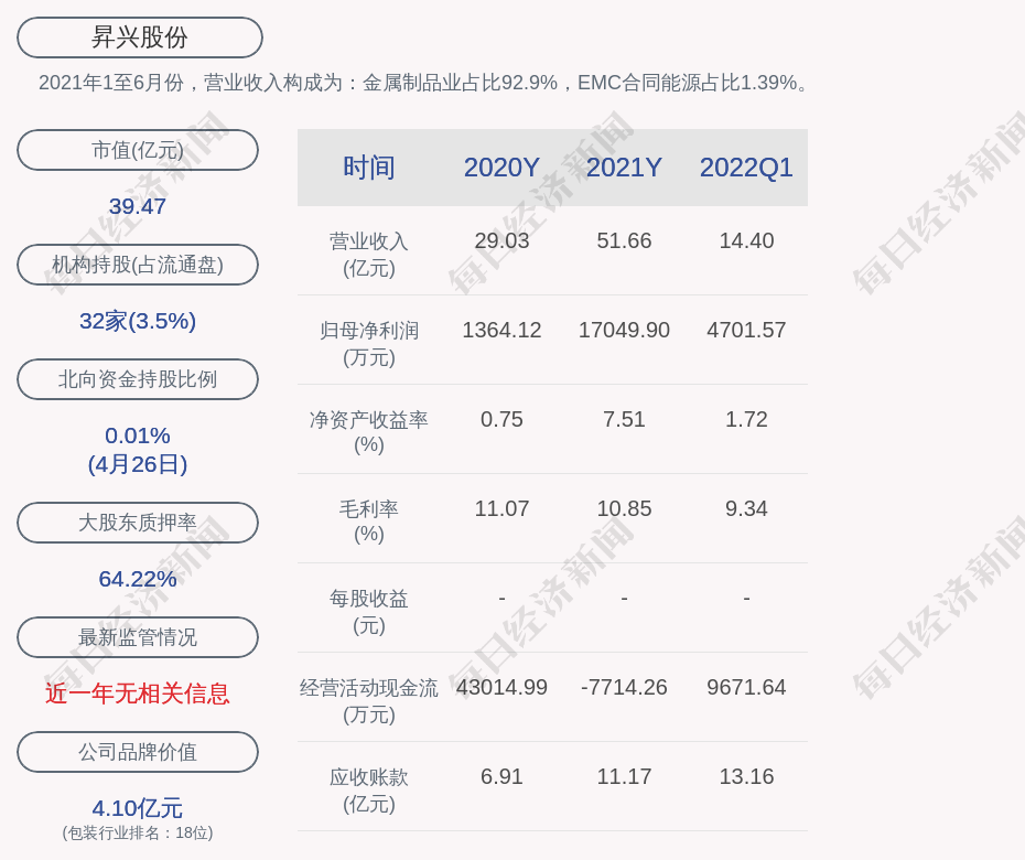 2021年1至6月份,昇兴股份的营业收入构成为:金属制品业占比92.9%,EMC合同能源占比1.39%。