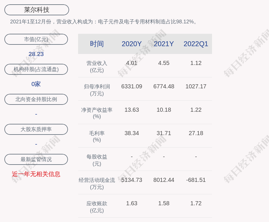 2021年1至12月份,莱尔科技的营业收入构成为:电子元件及电子专用材料制造占比98.12%。
