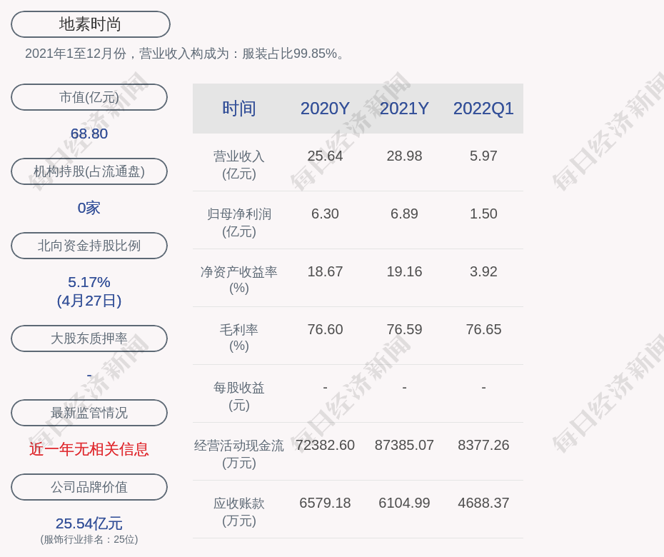 每经AI快讯,地素时尚(SH 603587,收盘价:14.3元)4月28日晚间发布年度业绩报告称,2021年营业收入约28.98亿元,同比增加13%;归属于上市公司股东的净利润约6.89亿元,同比增加9.47%;基本每股收益1.44元,同比增加9.92%。拟每10股派发现金股利10元(含税)。