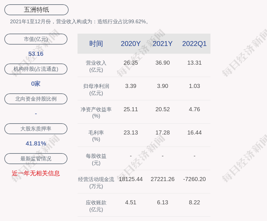 2021年1至12月份,五洲特纸的营业收入构成为:造纸行业占比99.62%。