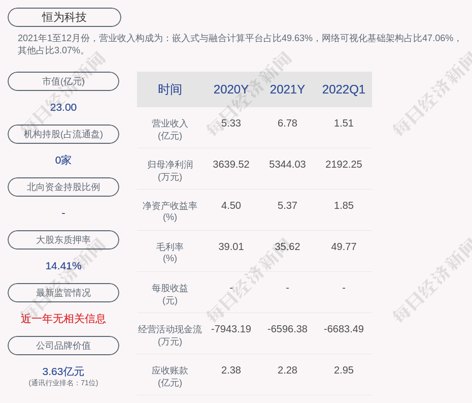 2021年1至12月份,恒为科技的营业收入构成为:嵌入式与融合计算平台占比49.63%,网络可视化基础架构占比47.06%,其他占比3.07%。