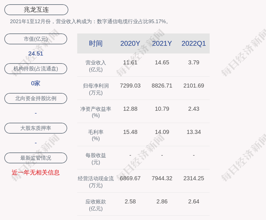 2021年1至12月份,兆龙互连的营业收入构成为:数字通信电缆行业占比95.17%。