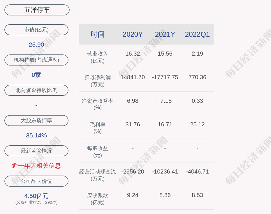 每经AI快讯,五洋停车(SZ 300420,收盘价:2.32元)4月28日晚间发布一季度业绩公告称,2022年第一季度营收约2.19亿元,同比减少5.94%;净利润约770万元,同比减少75.83%;基本每股收益0.0069元,同比减少81.4%。