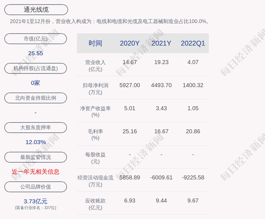 每经AI快讯,通光线缆(SZ 300265,收盘价:7元)4月28日晚间发布一季度业绩公告称,2022年第一季度营收约4.07亿元,同比增加44.14%;净利润约1400万元,同比增加10.09%;基本每股收益0.04元,同比增加33.33%。