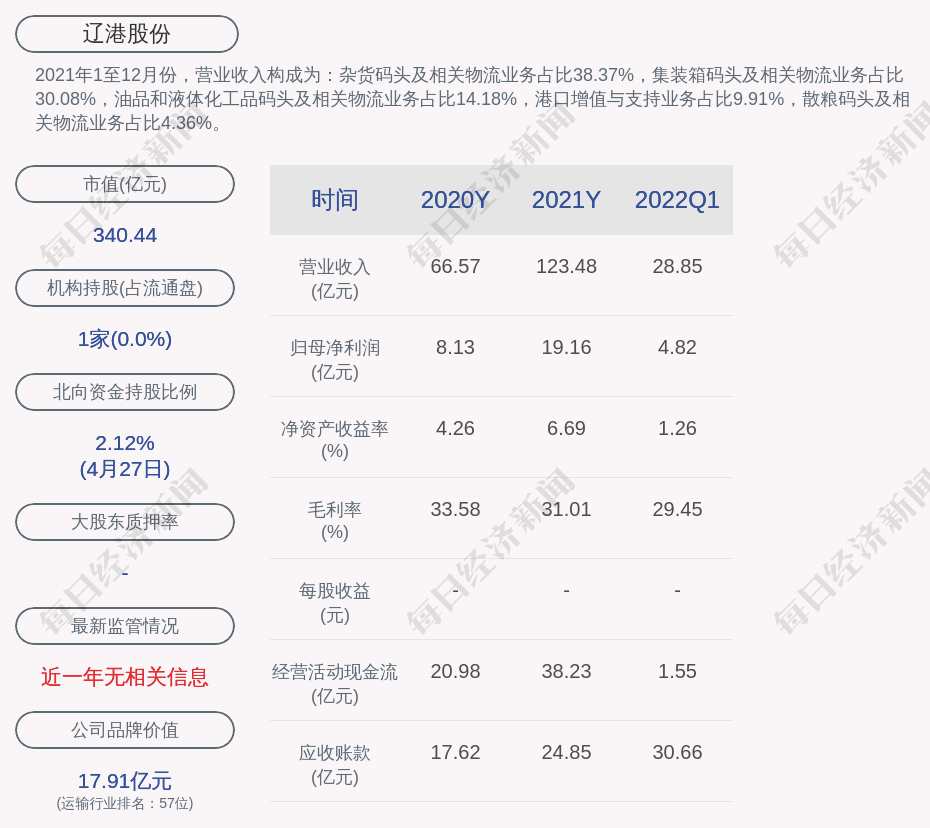 2021年1至12月份,辽港股份的营业收入构成为:杂货码头及相关物流业务占比38.37%,集装箱码头及相关物流业务占比30.08%,油品和液体化工品码头及相关物流业务占比14.18%,港口增值与支持业务占比9.91%,散粮码头及相关物流业务占比4.36%。