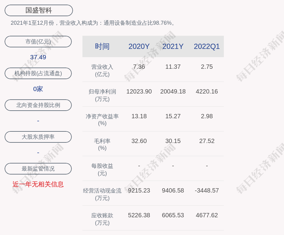 2021年1至12月份,国盛智科的营业收入构成为:通用设备制造业占比98.76%。