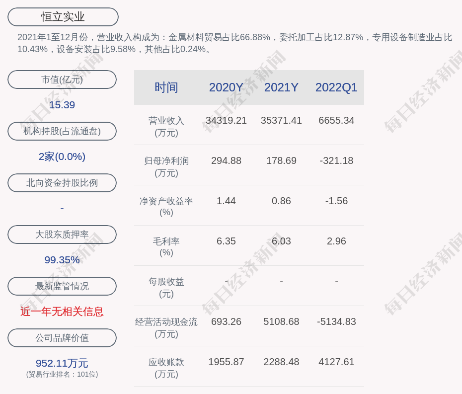 2021年1至12月份,恒立实业的营业收入构成为:金属材料贸易占比66.88%,委托加工占比12.87%,专用设备制造业占比10.43%,设备安装占比9.58%,其他占比0.24%。