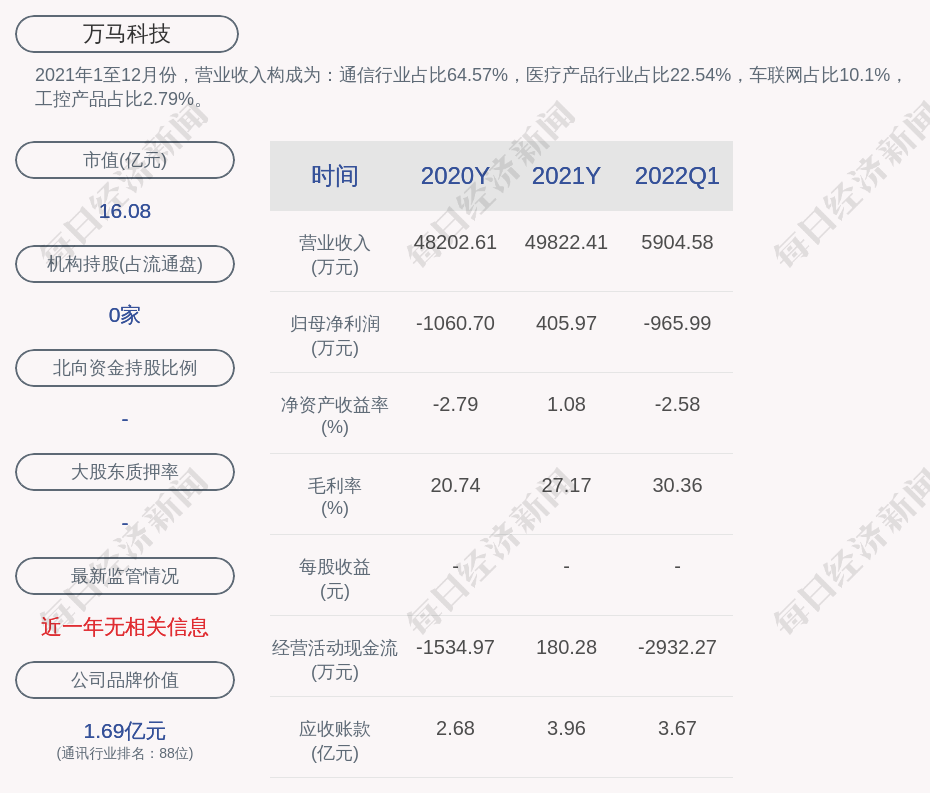 2021年1至12月份,万马科技的营业收入构成为:通信行业占比64.57%,医疗产品行业占比22.54%,车联网占比10.1%,工控产品占比2.79%。