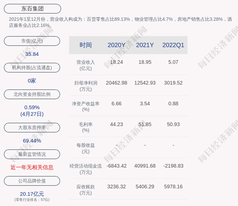 每经AI快讯,东百集团(SH 600693,收盘价:3.99元)4月28日晚间发布一季度业绩公告称,2022年第一季度营收约5.07亿元;归属于上市公司股东的净利润约3020万元;基本每股收益0.0347元。