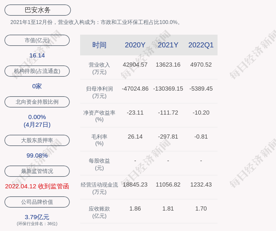 每经AI快讯,巴安水务(SZ 300262,收盘价:2.41元)4月28日晚间发布一季度业绩公告称,2022年第一季度营收约4971万元,同比减少52.78%;归属于上市公司股东的净利润亏损约5389万元;基本每股收益亏损0.08元。