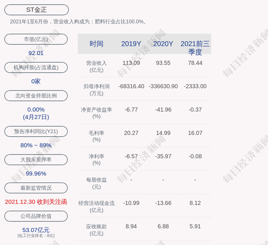 2021年1至6月份,ST金正的营业收入构成为:肥料行业占比100.0%。