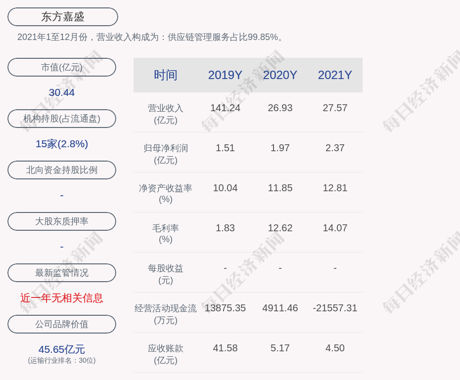 2021年1至12月份,东方嘉盛的营业收入构成为:供应链管理服务占比99.85%。