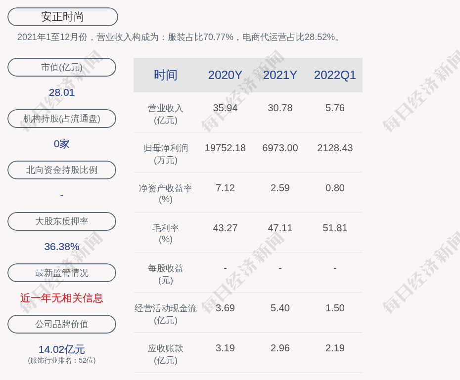 每经AI快讯,安正时尚(SH 603839,收盘价:7元)4月29日晚间发布一季度业绩公告称,2022年第一季度营收约5.76亿元;归属于上市公司股东的净利润约2128万元;基本每股收益0.05元。