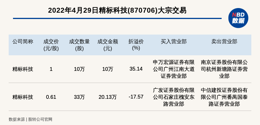 每经讯,2022年4月29日,新三板创新层公司精标科技(870706)发生2笔大宗交易,溢价率最高的一笔成交价1元/股,成交数量10万股,成交金额10万元,溢价35.14%。买入营业部是申万宏源证券有限公司广州江南大道证券营业部,卖出营业部是南京证券股份有限公司杭州新塘路证券营业部。