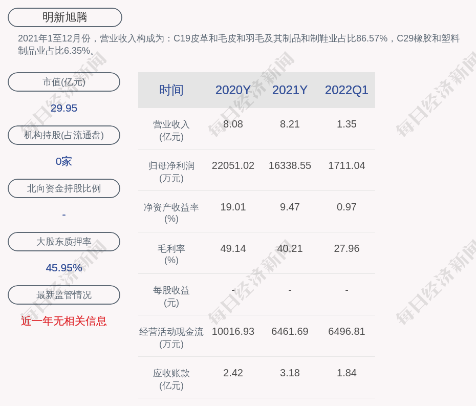 2021年1至12月份,明新旭腾的营业收入构成为:C19皮革和毛皮和羽毛及其制品和制鞋业占比86.57%,C29橡胶和塑料制品业占比6.35%。