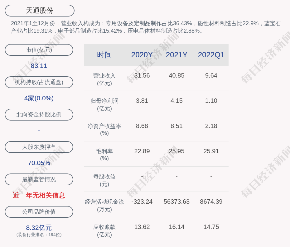 每经AI快讯,天通股份(SH 600330,收盘价:8.34元)4月29日晚间发布一季度业绩公告称,2022年第一季度营收约9.64亿元;归属于上市公司股东的净利润约1.1亿元;基本每股收益0.11元。