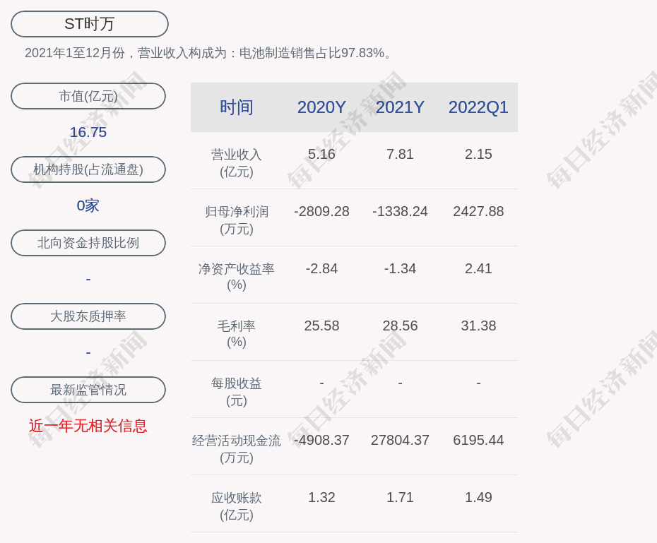2021年1至12月份,ST时万的营业收入构成为:电池制造销售占比97.83%。