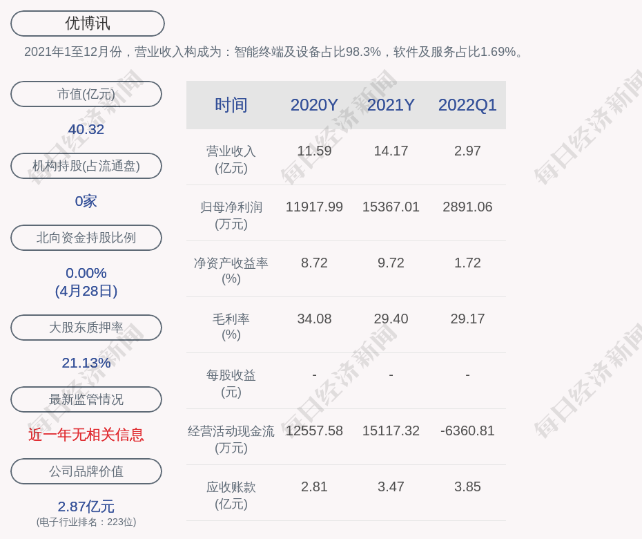 2021年1至12月份,优博讯的营业收入构成为:智能终端及设备占比98.3%,软件及服务占比1.69%。